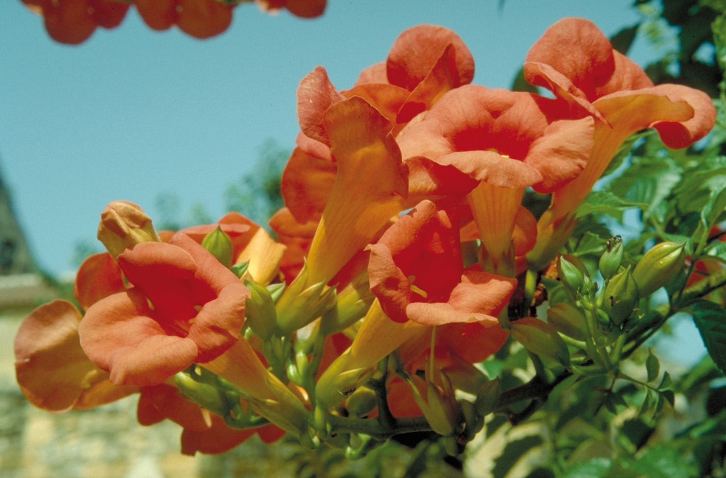 Floraison en forme de trompette rouge saumoné, regroupées en bouquets sur la plante, de 5 à 7 cm de diamètre de juillet à septembre.