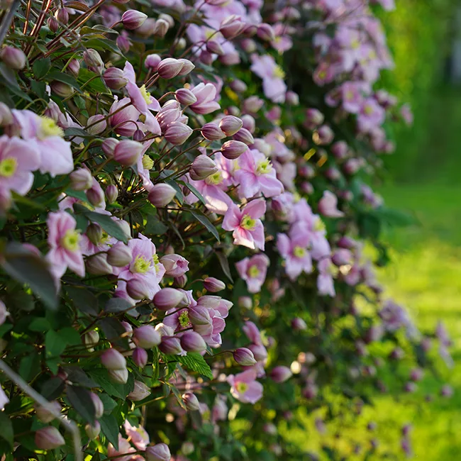 Cette variété est l’un des clématites montana les plus populaires. L’espèce clematis montana se caractérise par sa floraison printanière très abondante et sa vigueur. Elle est portée sur les bois de l’année précédente. La clématite Mayleen produit une multitude de petites fleurs rose pâle. Sa floraison de printemps peut être remontante en été.