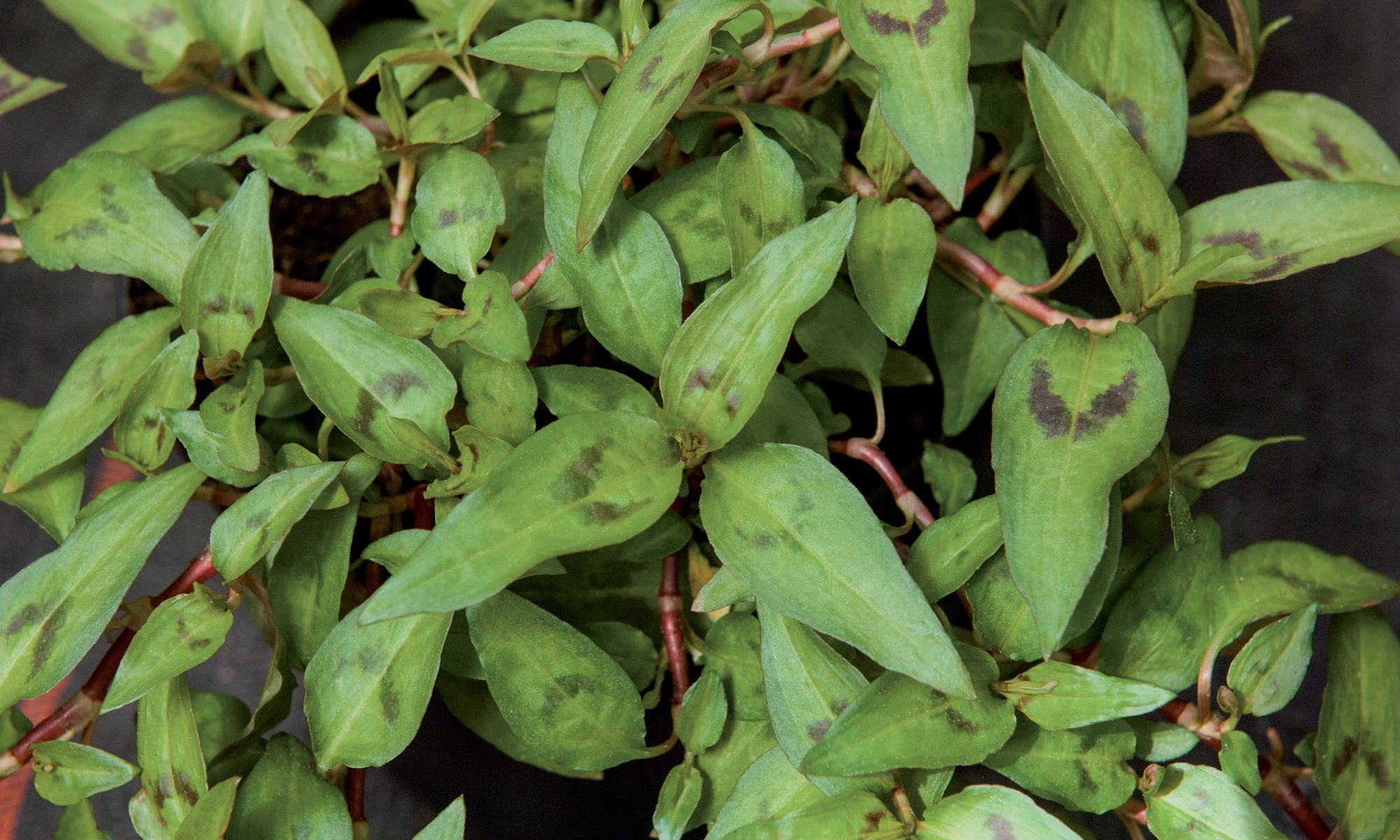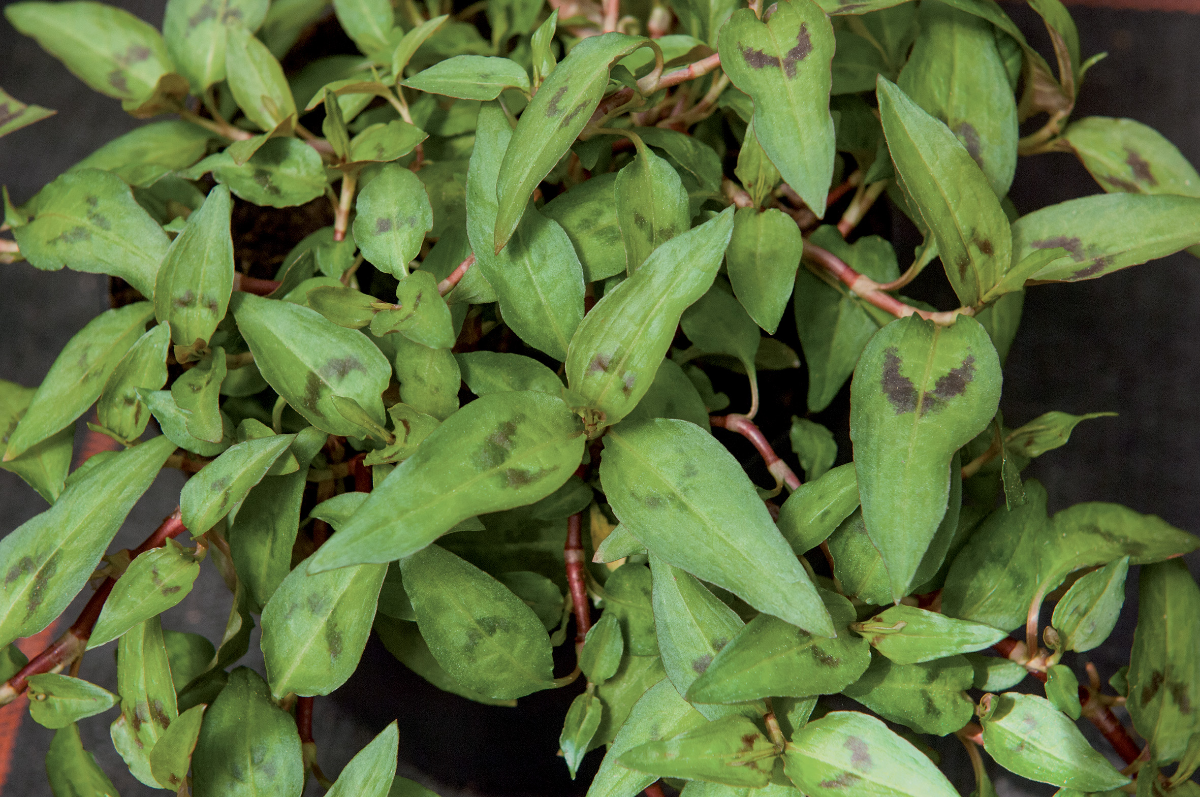 Vivace rampante avec un très joli feuillage lancéolé marqué d’une tache sombre en V.