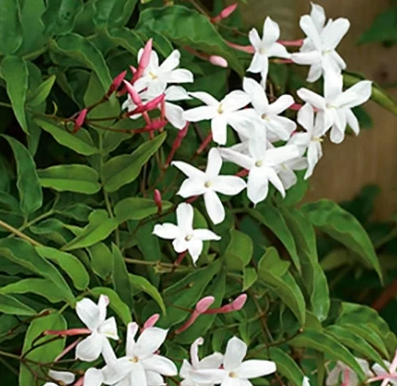 Jasmin d’été. Liane grimpante qui demande à être palissée. Elle peut atteindre de 3 à 5 m.