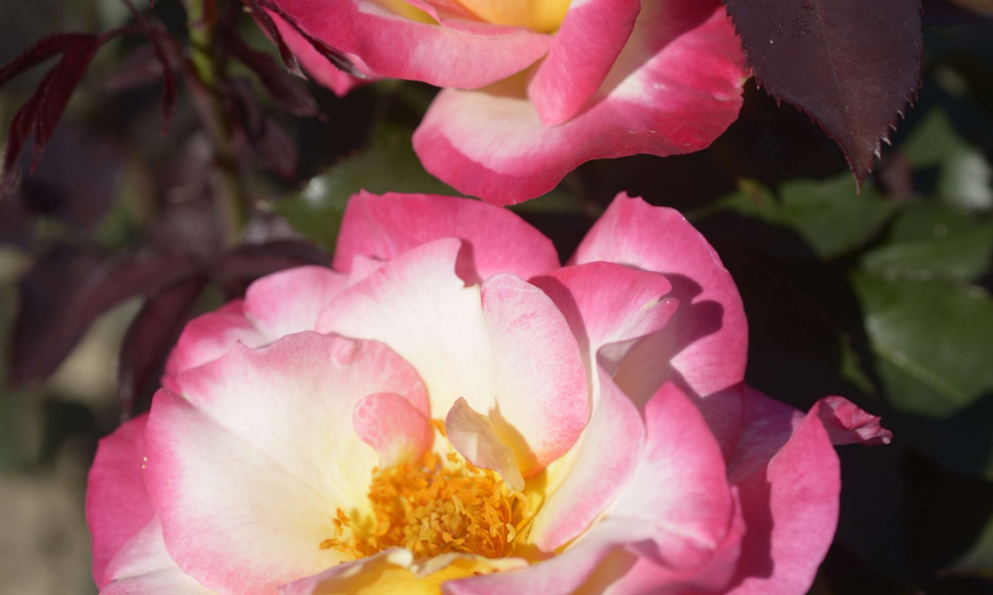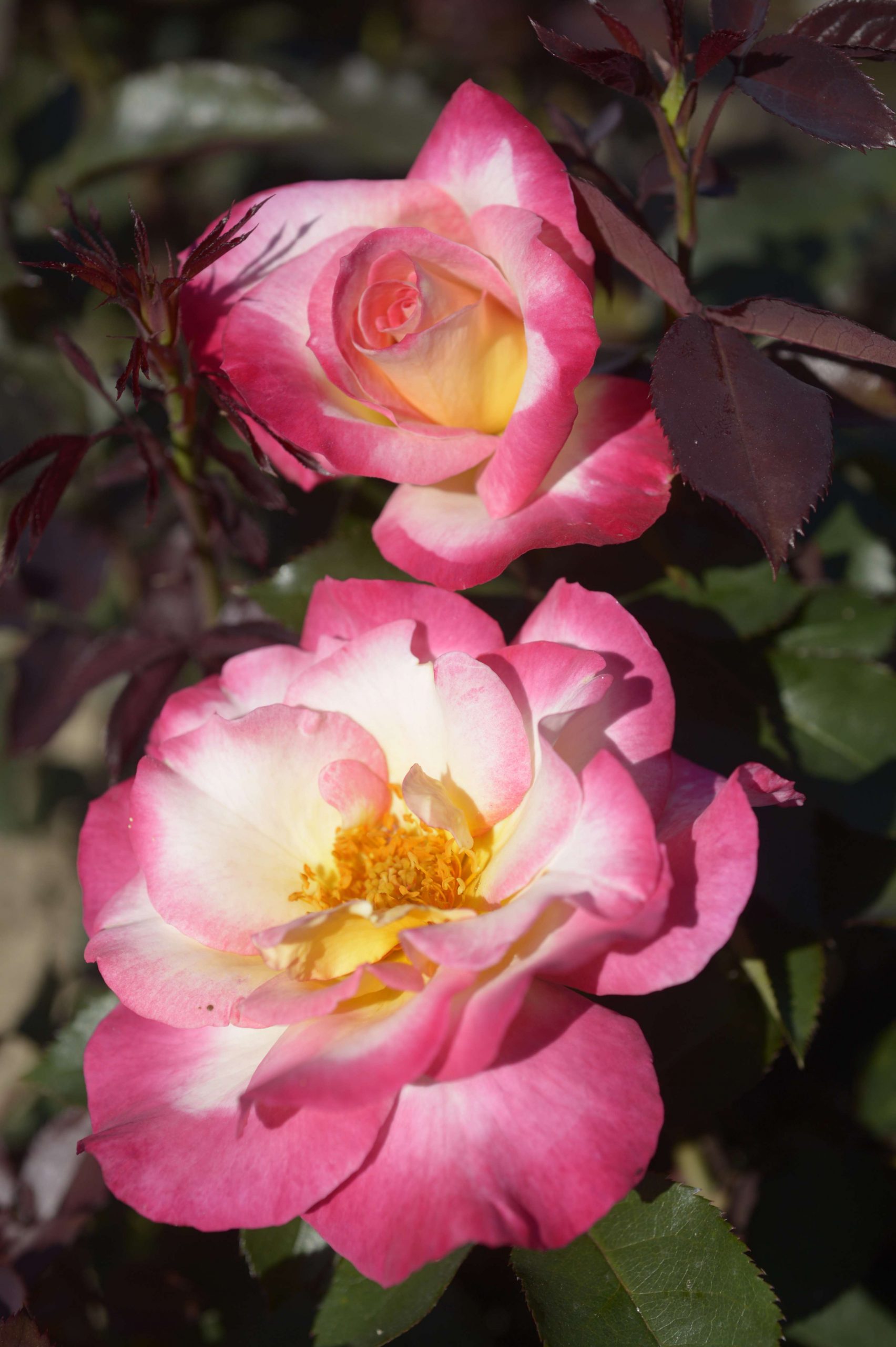 Fleurs groupées lumineuses et bicolores au parfum citronné, très remontantes et semi-doubles.