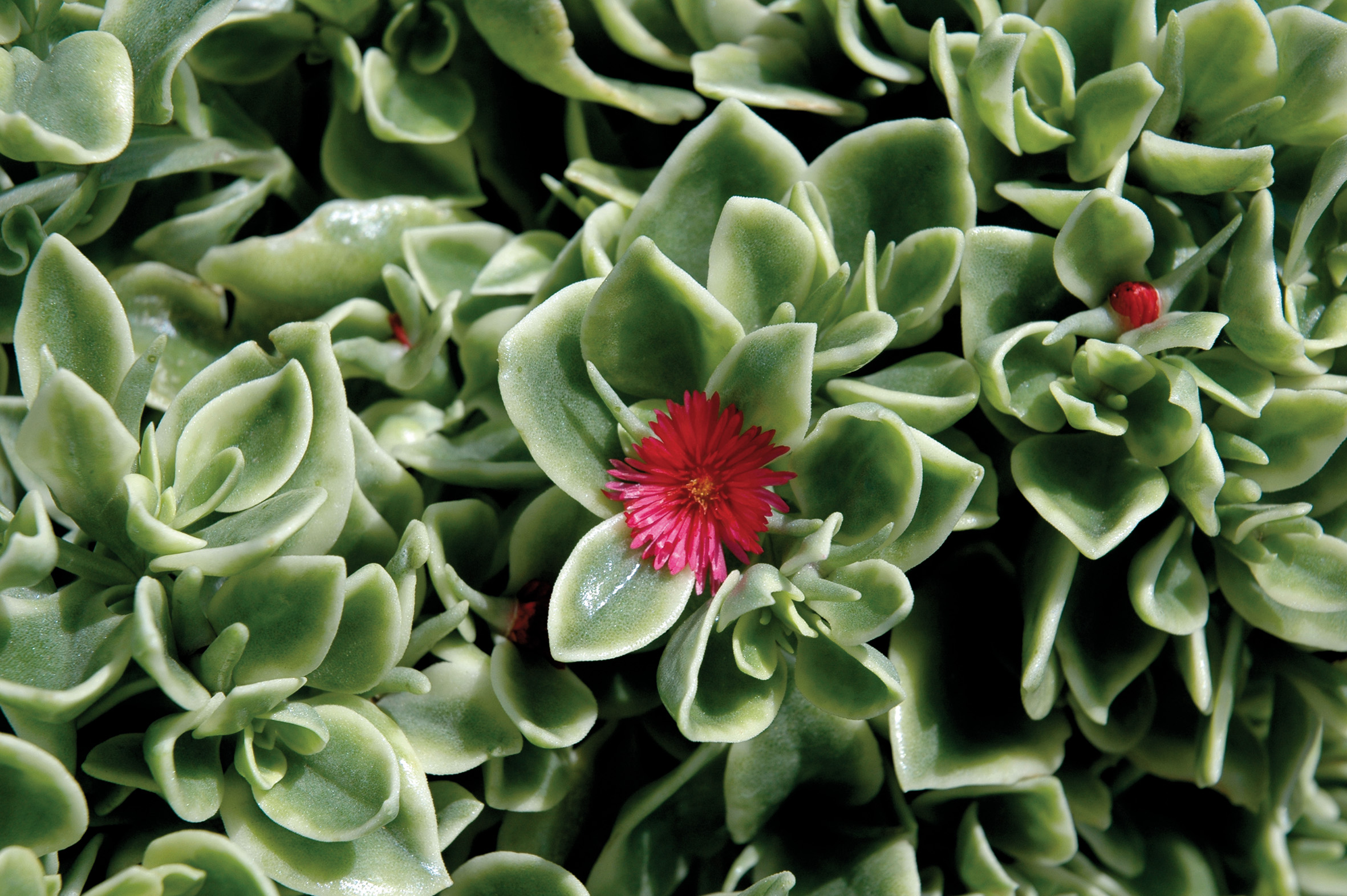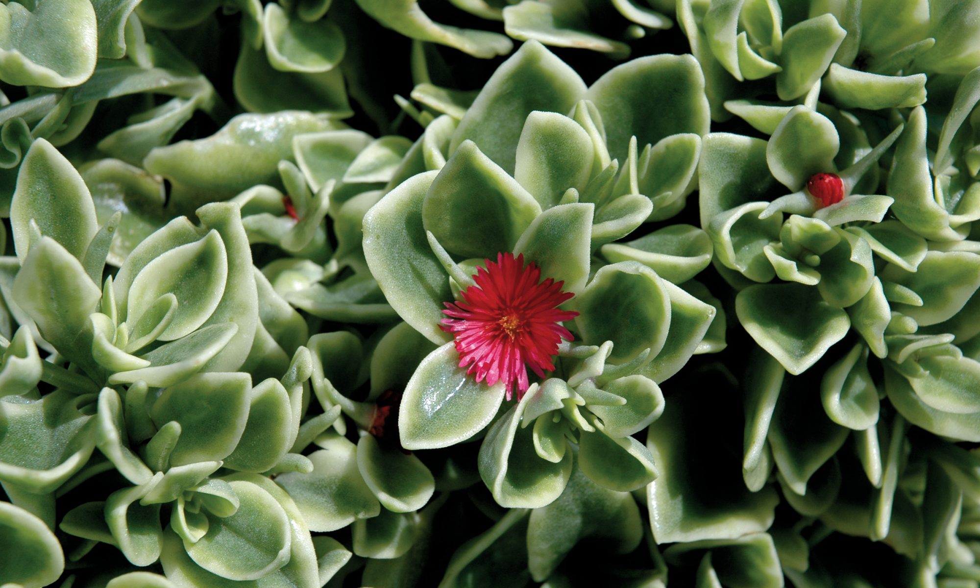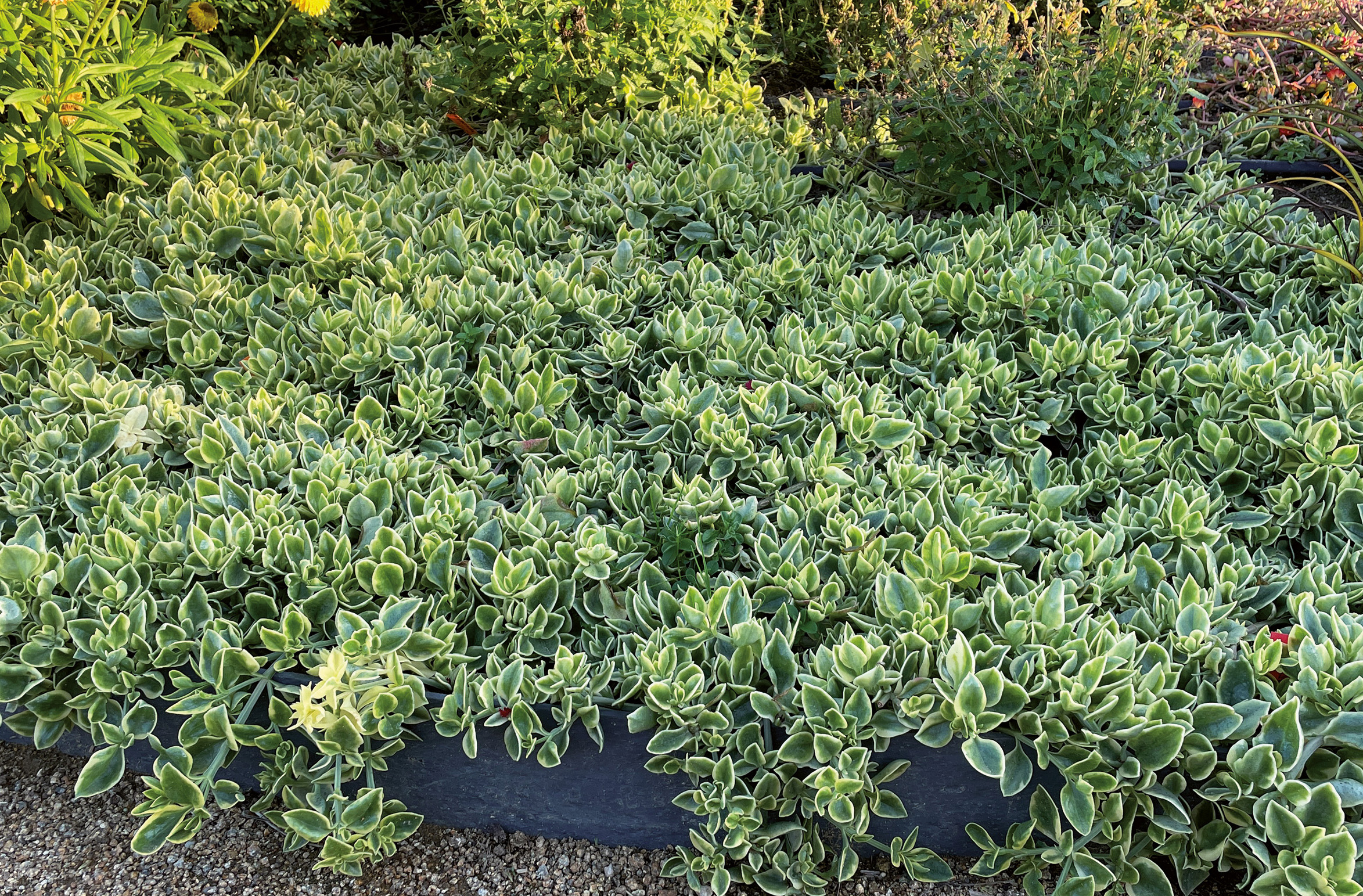 Plante tapissante aux feuilles succulentes d’un vert bordé de blanc.