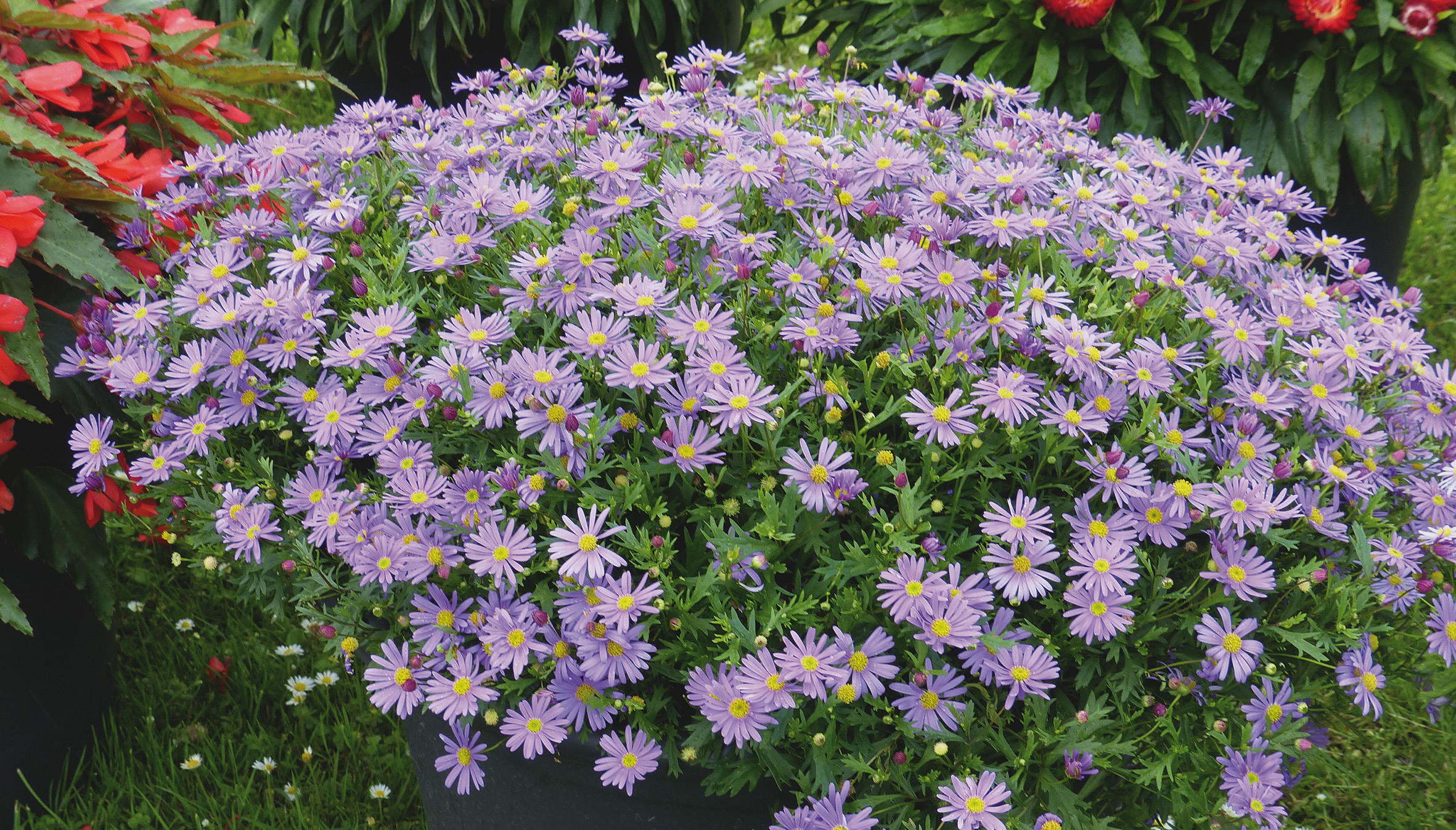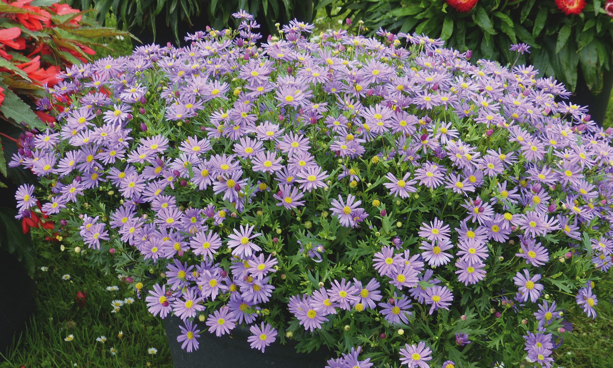 Multitudes de grandes fleurs bleu lavande en forme de marguerites.