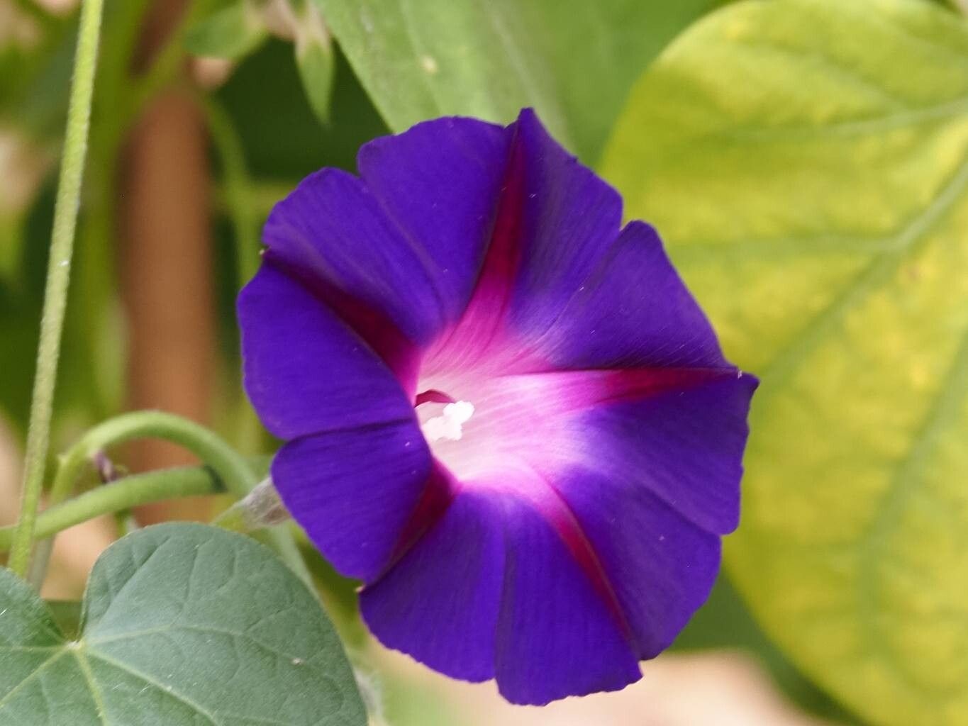 Fleurs en forme de trompette bleu violet pourpre à gorges blanches.