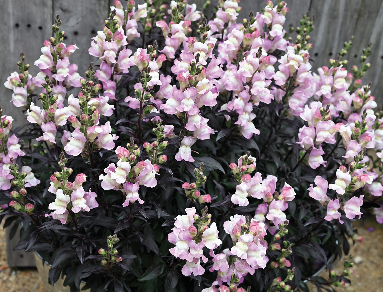 Port droit. Superbe variété de muflier au feuillage noir qui produit des hampes flroales roses clairs.