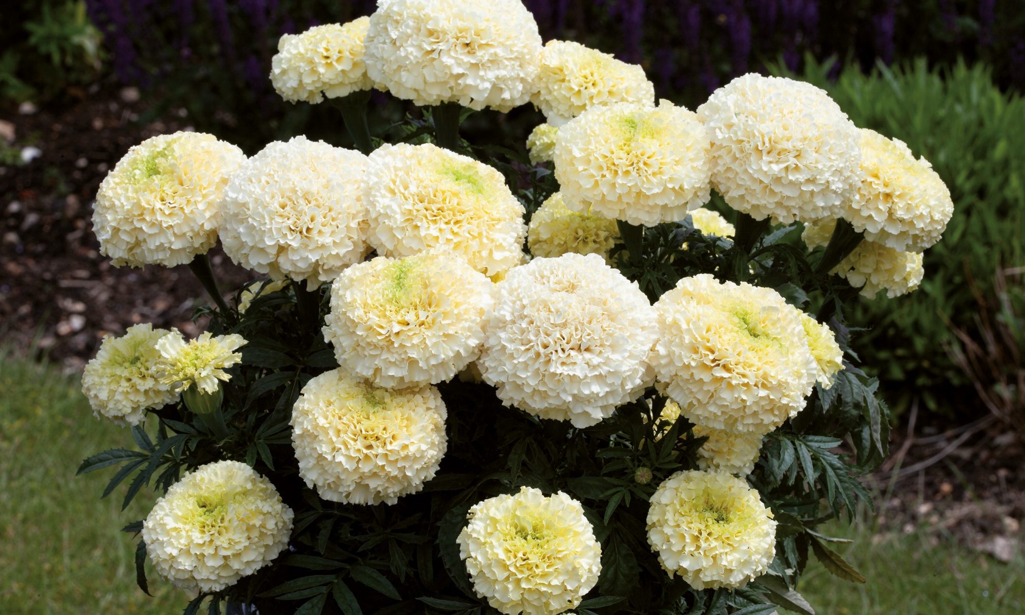 Fleurs doubles dans les tons de jaune, orange et vanille formant de beaux pompons.